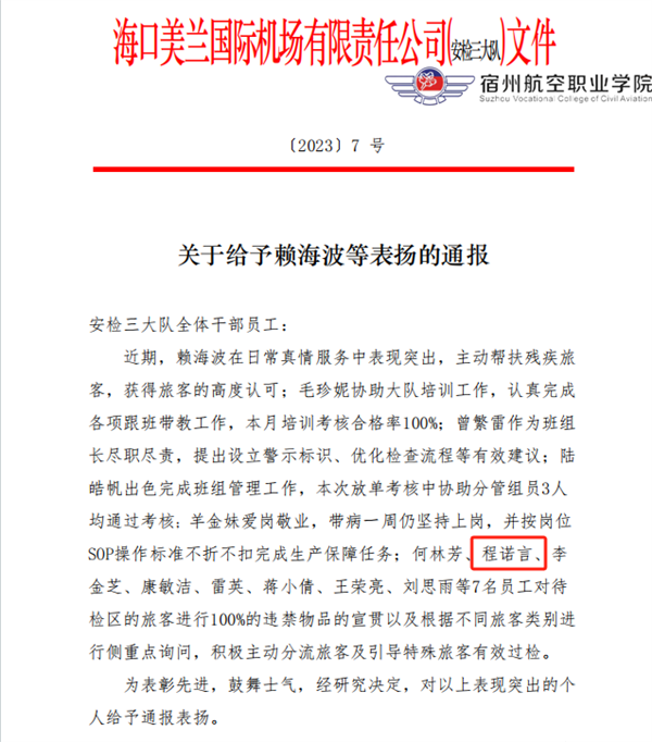 程诺言时时刻刻谨记岗位职责👩🦽➡️,坚守岗位底线🍴,始终坚持岗位操作流程,不排除疑点绝不放过,用自己的责任心书写着对安检工作的热爱。凭借自己认真负责👎🏽、细致入微的工作态度,程诺言也收获了旅客的点赞及安检站表彰。