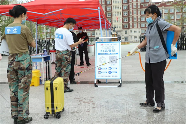 校门口设有消毒通道,工作人员对学生行李、书包等物品进行酒精消毒,依次通过体温检测点🤽♀️。