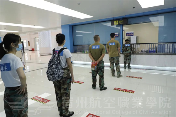 在报到缴费环节,同学们排成一路纵队🦻♟,按照地面分隔线间隔1.5米,缴费前进行手部消毒👮♂️。