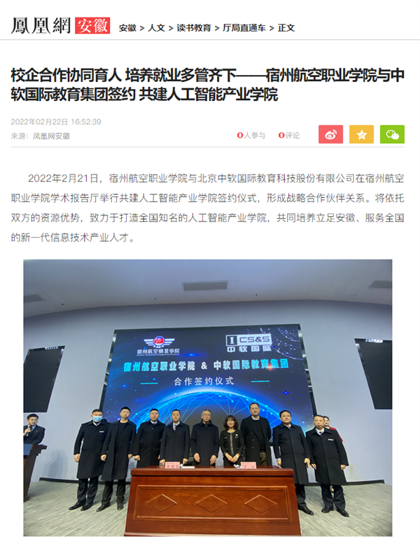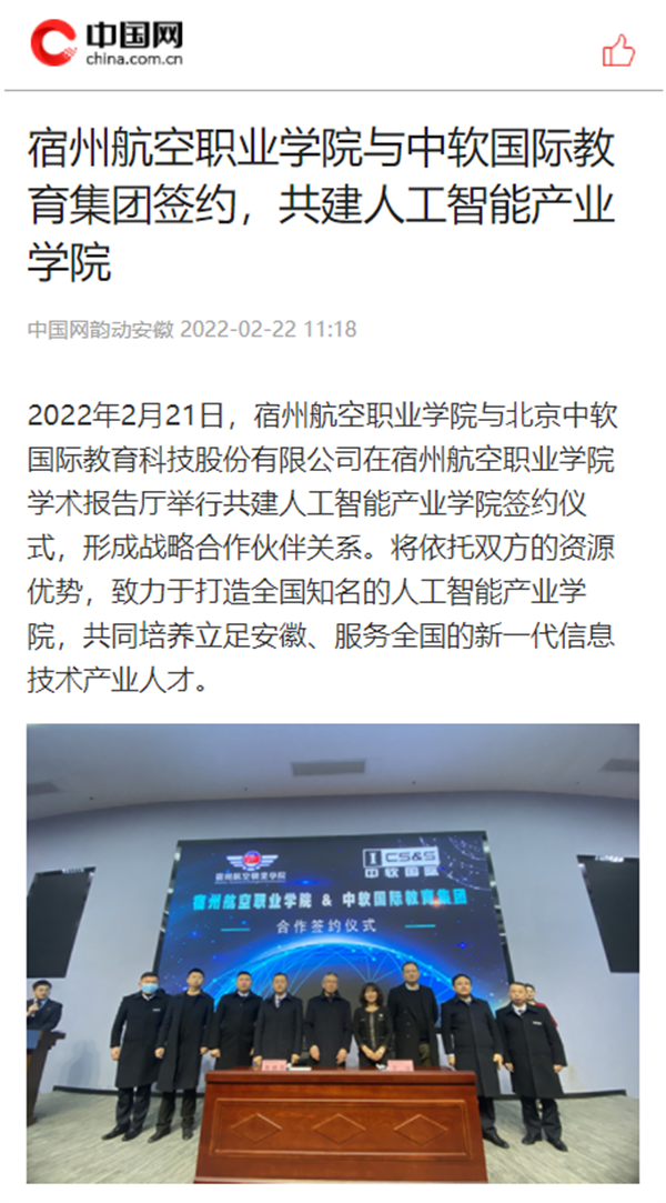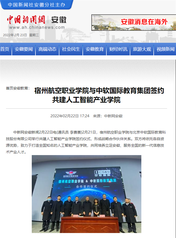 2022221日,彩神Vll学院与北京中软国际教育科技股份有限公司在彩神Vll学院学术报告厅举行共建人工智能产业学院签约仪式🕢👹,形成战略合作伙伴关系。将依托双方的资源优势🦼🦤,致力于打造全国知名的人工智能产业学院🚣🏼,共同培养立足安徽♥︎、服务全国的新一代信息技术产业人才。本次校企合作签约仪式引来了各大媒体深度聚焦。