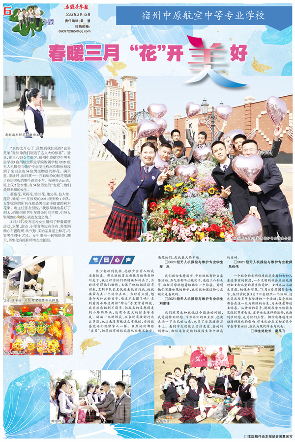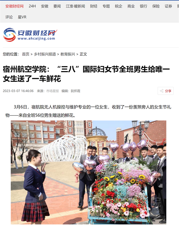 3月6日,宿航院无人机操控与维护专业的一位女生🧑🏻🚀,收到了一份羡煞旁人的女生节礼物——来自全班56位男生赠送的鲜花。此次活动引来了各大媒体的深度聚焦。