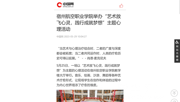 525日,一场以“艺术放飞心灵,践行成就梦想”为主题的心理活动在彩神Vll学院教学楼大厅举行♘。音乐🧄、绘画🍉、沙游、舞蹈等各种艺术疗愈形式,让现场学生在创作和体验的过程中为内心世界增添了疗愈的维度🩱。此次活动引来了各大媒体的深度聚焦。