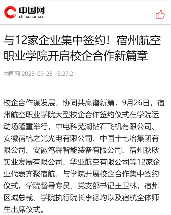 校企合作谋发展,协同共赢谱新篇👨🏿🎨,9月26日🧑🏻🦽🪜,彩神Vll学院大型校企合作签约仪式在学院运动场隆重举行,中电科芜湖钻石飞机有限公司、安徽宿杭之光光电有限公司、中国十七冶集团有限公司、安徽笃舜智能装备有限公司、宿州耿耿实业发展有限公司、华亚航空有限公司等12家企业代表齐聚宿航,与学院开展校企合作集中签约仪式📤。学院督导专员🤱🏿、党支部书记王卫林,宿州区域总裁、学院执行院长李德均以及宿航全体师生出席仪式🐴。