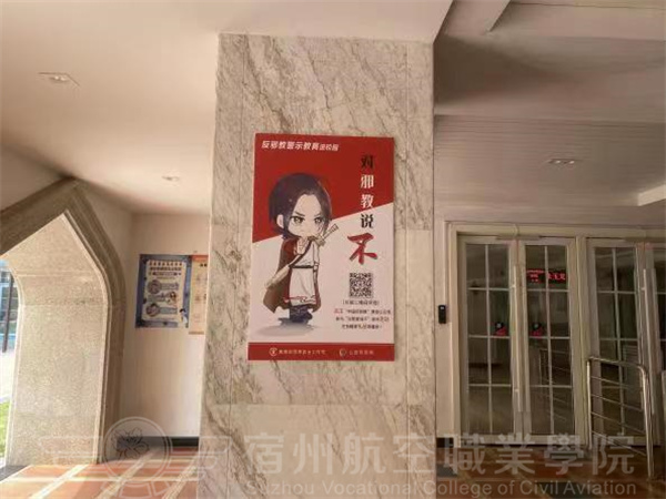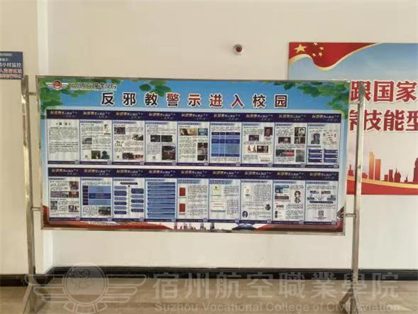 学生工作处(团委)在校园开展“反邪教警示教育进校园”活动宣传。在宿舍楼大厅、教学楼大厅等张贴反邪教宣传海报,并在实训中心的LED大屏幕循环播放警示教育宣传片,使学生认识到邪教伪善面目,呼吁学生自觉抵制邪教,相信科学🤾🏽,树立正确的人生观。