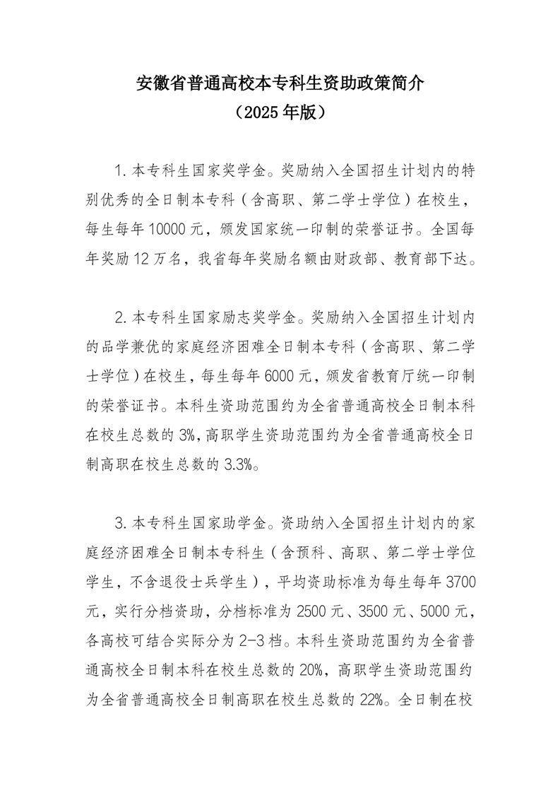 安徽省普通高校本专科生资助政策简介(2025年版)
