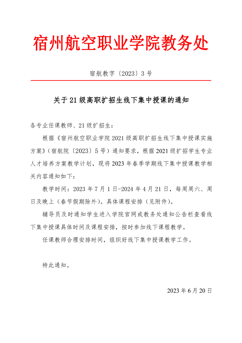 关于21级高职扩招生线下集中授课的通知