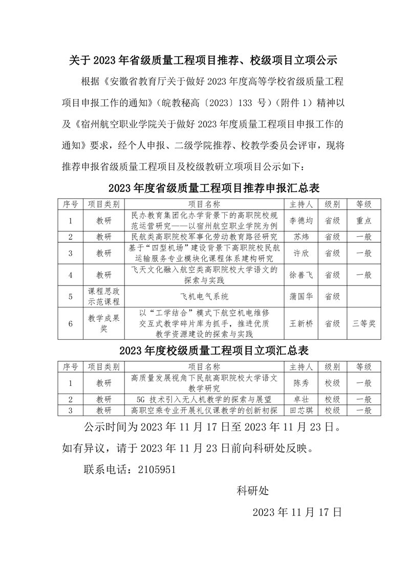 关于2023年省级质量工程项目推荐、校级项目立项公示