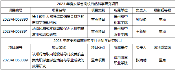 近日,安徽省教育厅下发《安徽省教育厅关于审核同意有关高校2023年度科研计划的通知》(皖教秘科〔20236号)👨🏻‍🍳,我院《稀土改性天然纤维增强复合材料的摩擦学性能研究》和《涵道风扇式多旋翼植保无人机药箱复用式结构研究》2个自然科学研究项目和《认知行为取向班级辅导对改善航空类高职学生学业情绪与学业成就的效果研究》1个哲学社会科学研究项目喜获立项,项目级别为重点项目🤟🏻,建设周期为2年。