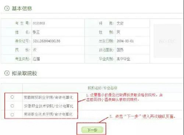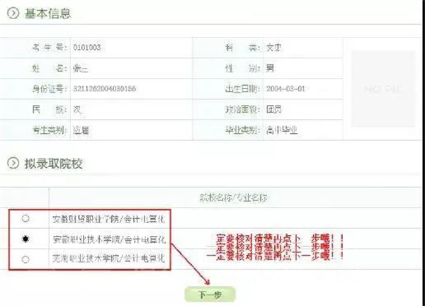 选择准备确认的学校,再次检查无误后再点击“下一步”: