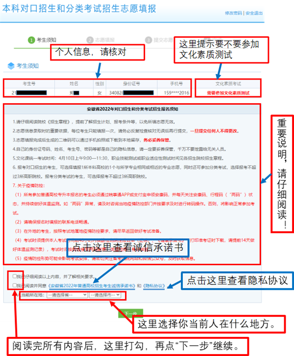 4.核对个人信息,点击查看“报名须知”、“诚信承诺书”、“隐私协议”并“打勾”👶🏽,填写“本人当前所在地”后,点击“下一步”。