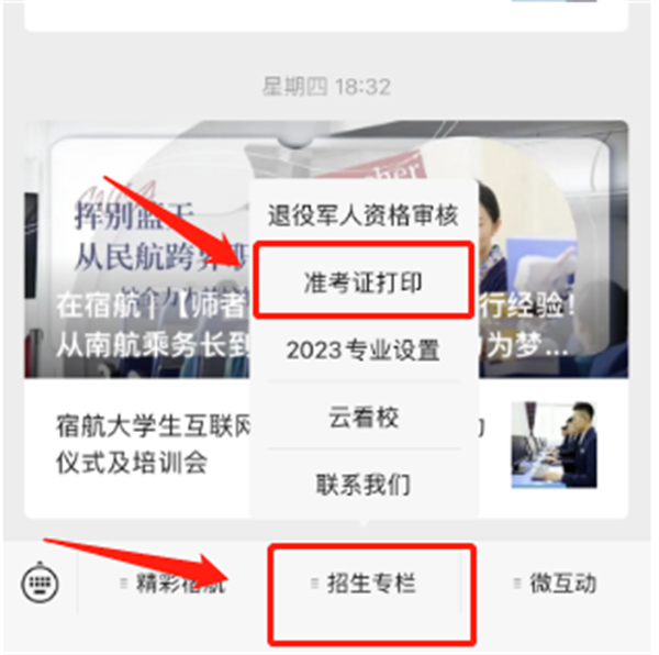 2.进入公众号后点击下方“招生专栏”👷🏼♂️,之后点击上方“准考证打印”,进入准考证查询页面;