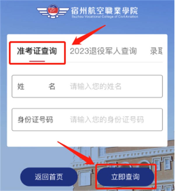 3.进入后点击“准考证查询”,根据提示填写“姓名”及“身份证号码”,核实无误后,点击下方“立即查询”🟦,即可查看准考证;