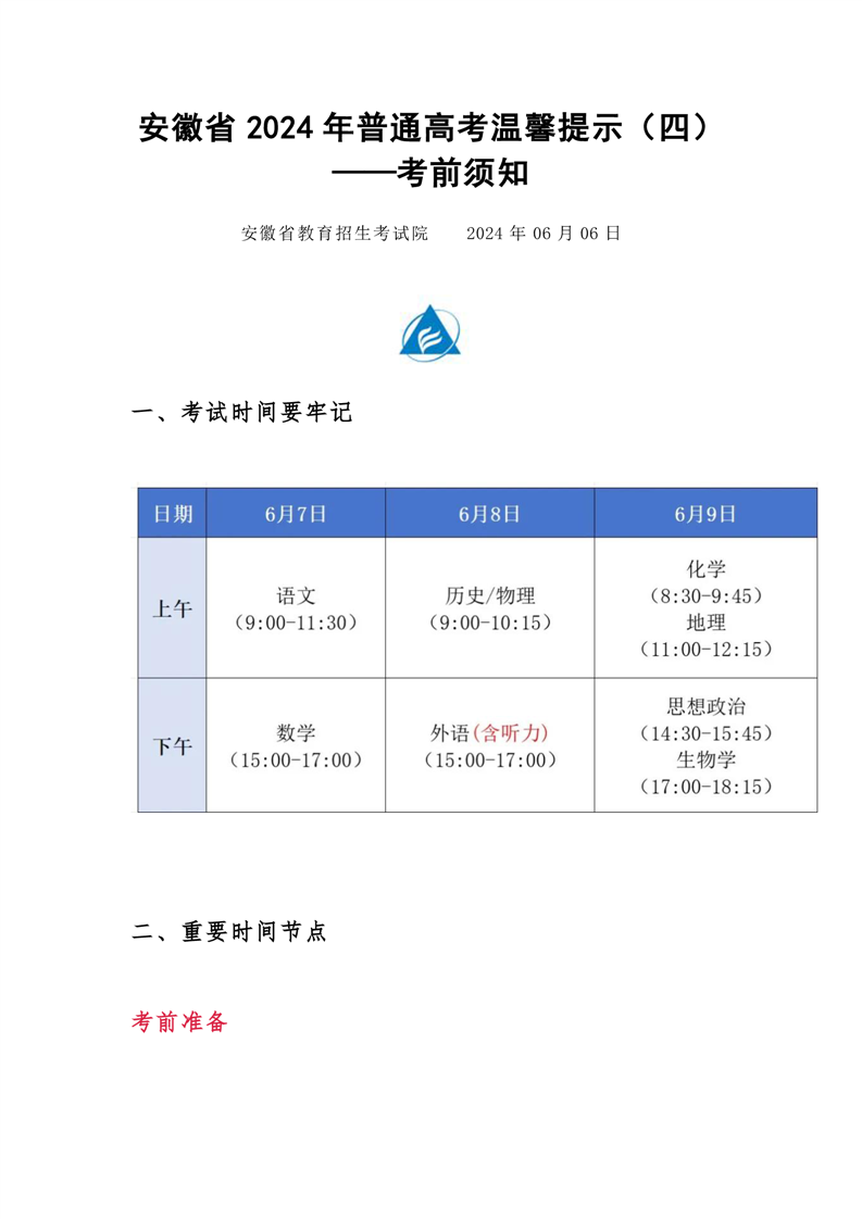 安徽省2024年普通高考温馨提示(四)