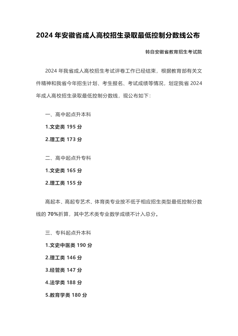 2024年安徽省成人高校招生录取最低控制分数线公布