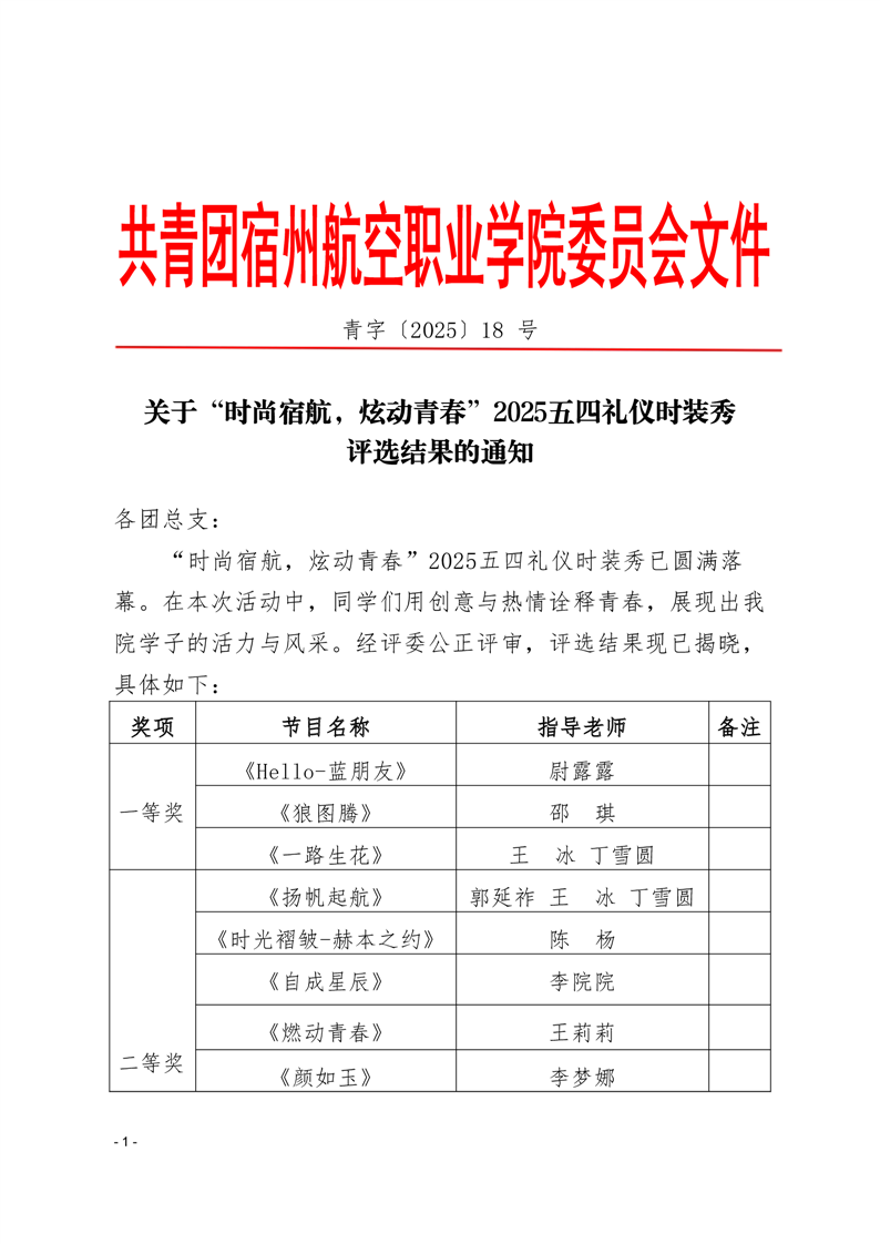 青字〔2025〕18号关于“时尚宿航👰🏽♂️🧙♂️,炫动青春”2025五四礼仪时装秀评选结果的通知