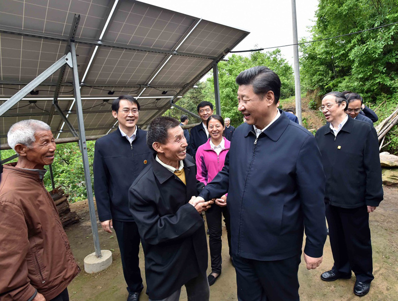 这是4月24日下午👩🏿🎓,习近平在六安市金寨县花石乡大湾村了解光伏发电扶贫电站建设运行情况。新华社记者李涛摄