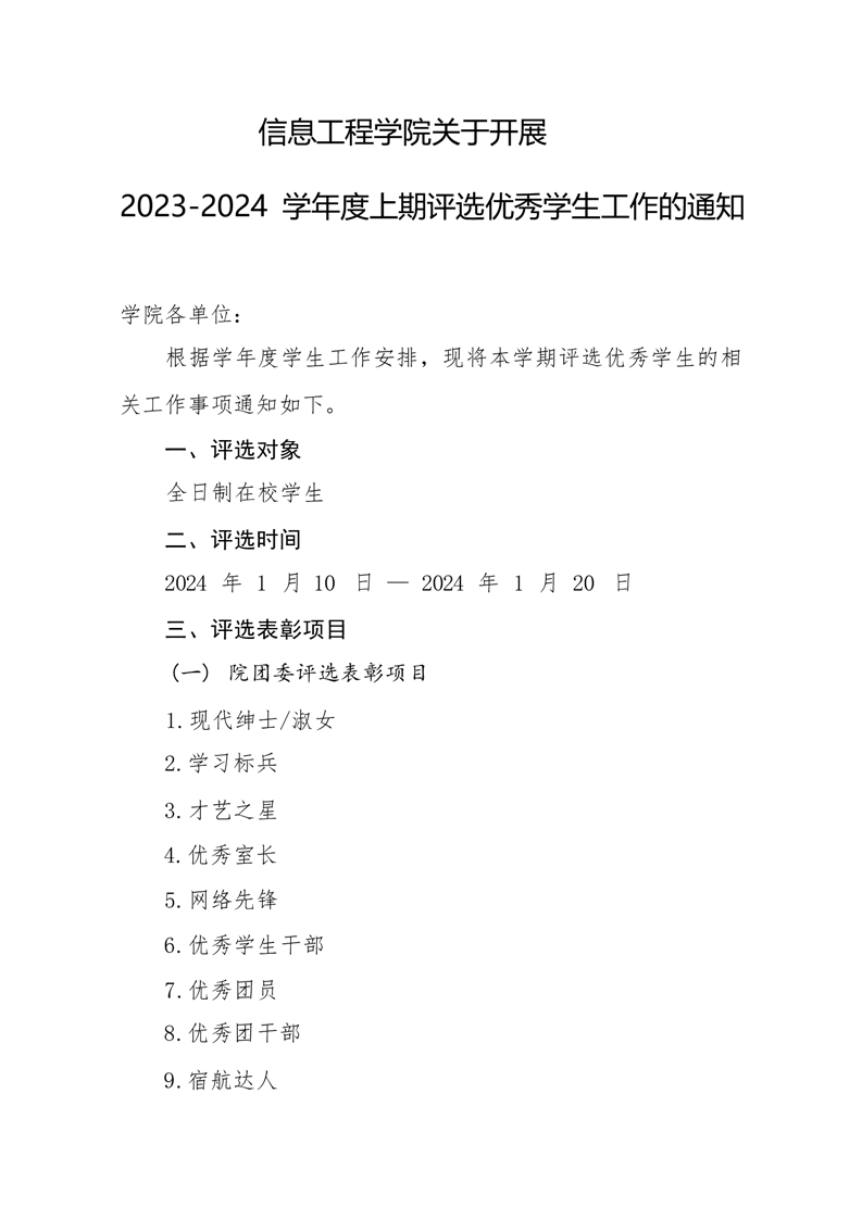 信息工程学院关于开展2023-2024学年度评选优秀学生工作的通知