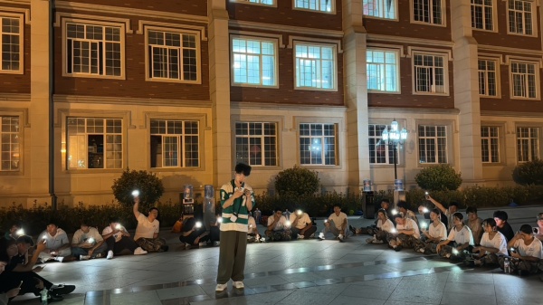 夜幕下的训练场灯火通明,歌声飞扬👨🏽✈️。同学们暂时卸下白天的疲惫💆🏿♀️🚤,踊跃登台展示才艺🧛🏻。歌曲演唱深情动人⛄️,赢得了现场阵阵掌声与喝彩。活动中🤷🏿♂️,辅导员纪伟也一展歌喉🌋,与同学们互动联欢🚂,将现场气氛推向高潮🧔♂️。