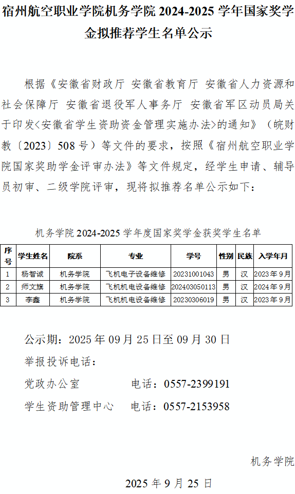 机务学院2024-2025学年国家奖学金拟推荐学生名单公示