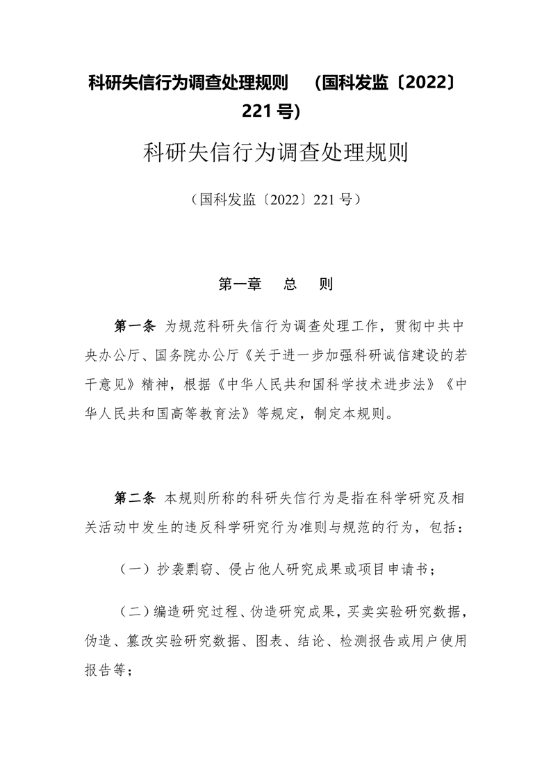 科研失信行为调查处理规则(国科发监〔2022〕221 号)